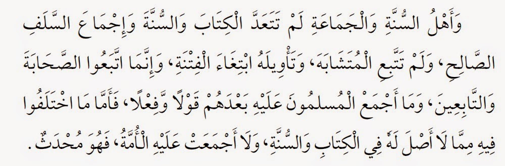 Ahlus sunnah wal-Jama`ah does not abstain or reject Kitaab or sunnah or the Ijmaa` of the salafus saliheen and neither delve into fitnah by adhering to ambigious and false interpretation rather we follow the sahaaba and taba`een and whatever the Muslim Ummah agrees upon (ijmaa) later on in their speech and action. And whatever the late comers have differed upon – if their views are not substantiated by Kitaab was-sunnah and neither by the Ijmaa` of the Muslims (of their or other former eras) then that is an innovation