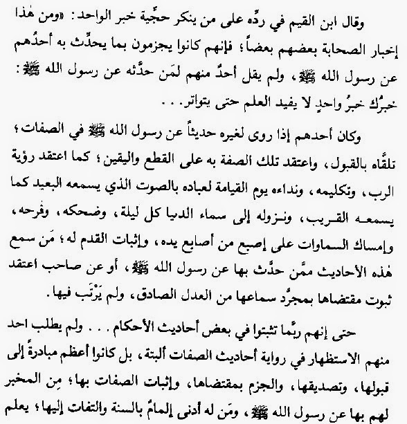 As for those who adopted the (strange) principle of believing that definite knowledge is not obtained from (ahad) prophetic traditions have opposed the consensus of the sahaaba on something (so obvious, crucial and basic) that it is known by necessity , and have opposed the consensus of the Taba`een and the consensus of the Imams of Muslims and thus subsequently have fallen in agreement with the stance of what the Mu`tazili, the Jahmi , Rawafidh and Khawarij hold it to be prohibited to take aqaid issues from khabarul wahid .and some usooliyeen and fuqaha happened to follow their stances otherwise no one among the salafus-saaliheen coincided or agreed to their (false) stance (of rejecting khabarul wahid)